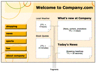 Example ESI template page containing ESI fragments and their expiration policies (TTL, or time-to-live)